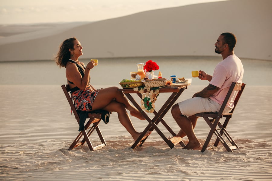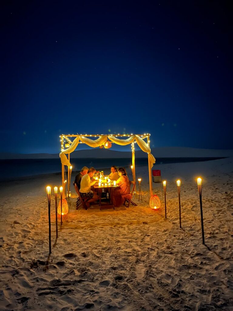 Jantar exclusivo nas dunas ao pôr do sol.